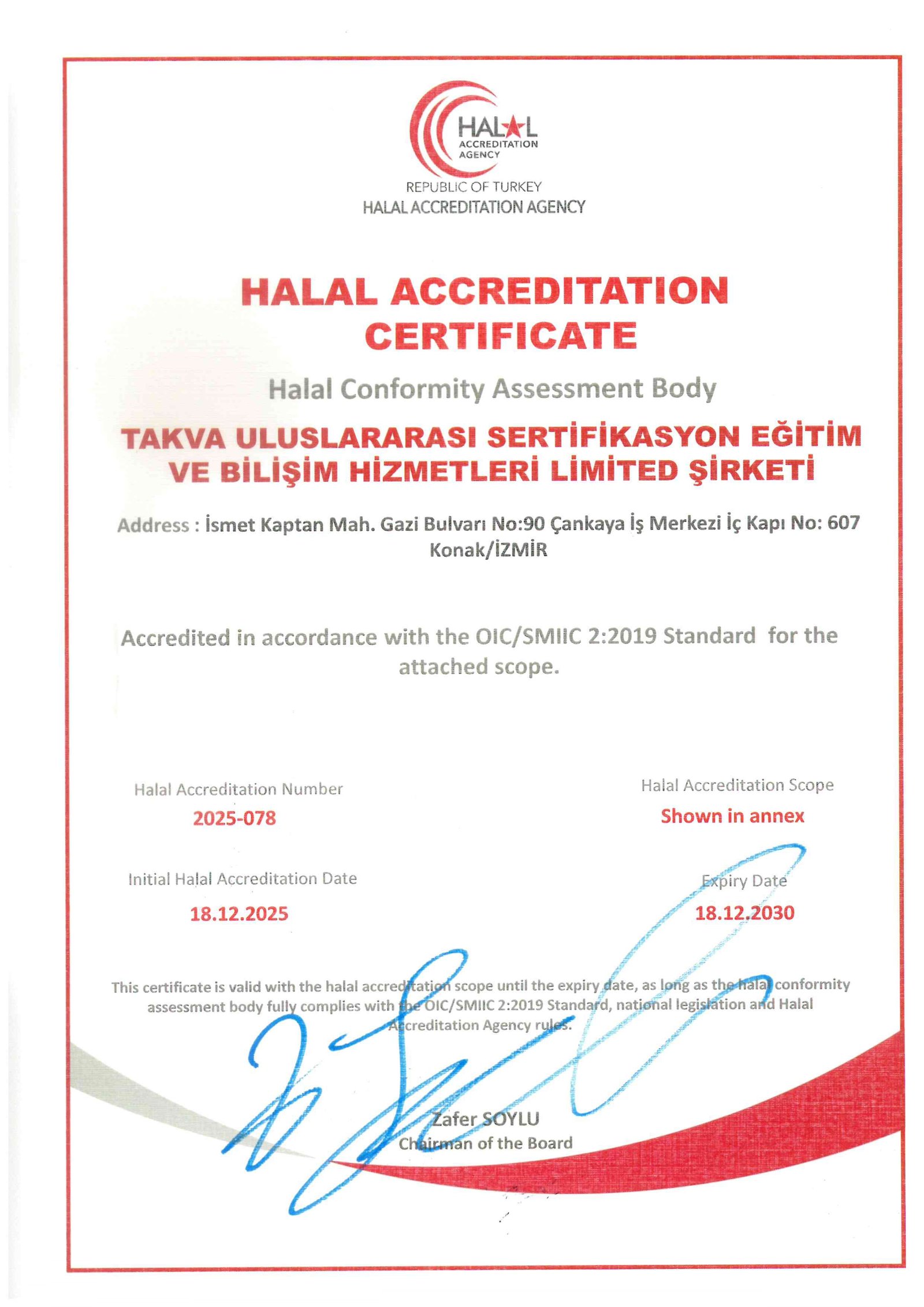 Helal Akreditasyon Kurumu tarafından ofis ve tanık tetkiklerimiz tamamlanmış olup, 18.12.2025 tarihinde akreditasyon kararımız yayınlanmıştır. Akreditasyon yetki ve kapsamlarımız aşağıdaki gibidir.